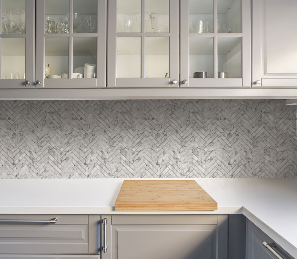 Geometrická kuchyňská a koupelnová vliesová tapeta s vinylovým povrchem, šedý mramor.
