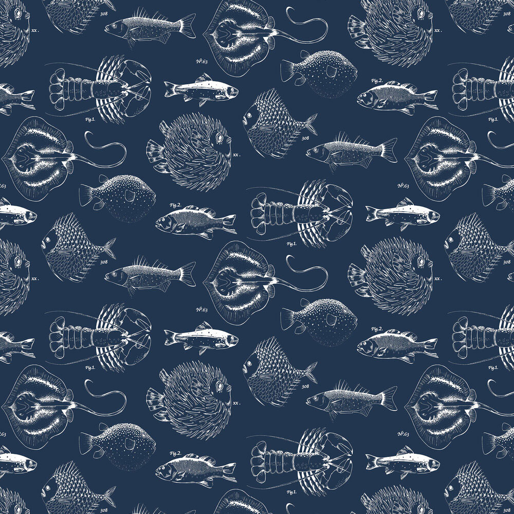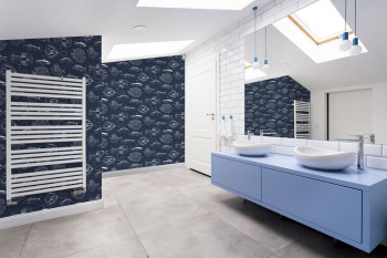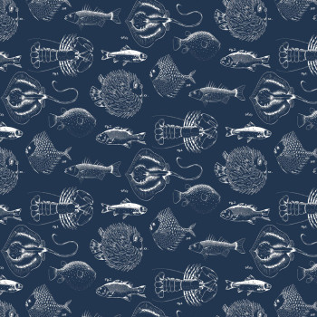 Vliesová tapeta s vinylovým povrchem v tmavě modré barvě a motivy mořských živočichů.