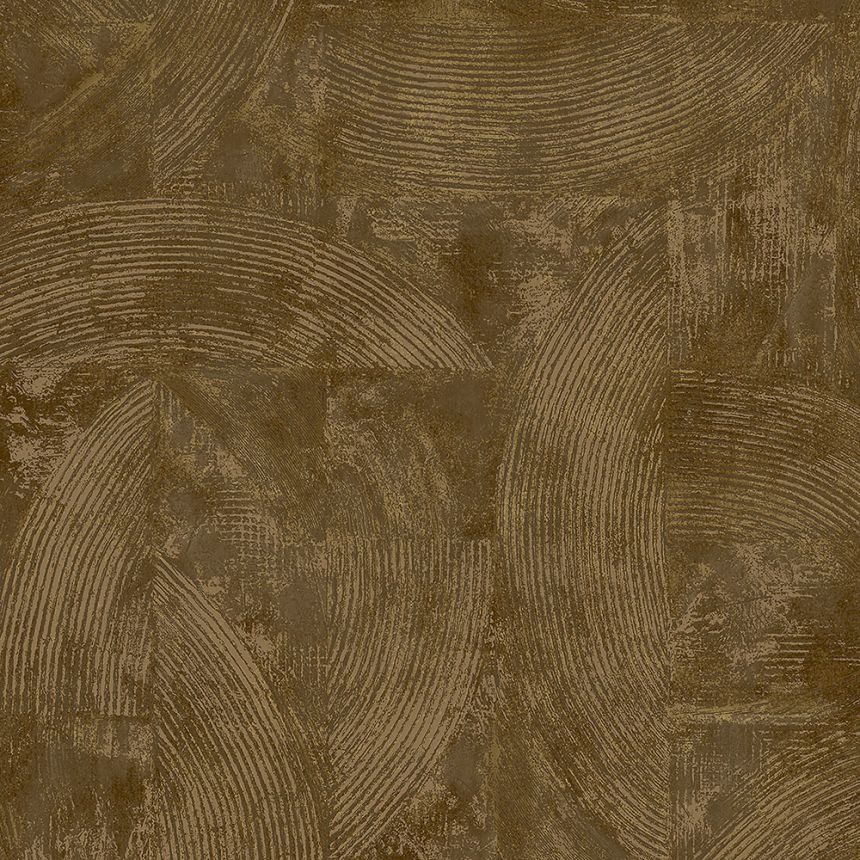 Hnědá vliesová tapeta s výrazným geometrickým štukovým vzorem a zlatými metalickými odlesky.