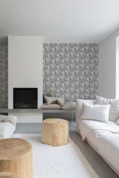 Šedá geometrická vliesová tapeta s výrazným moderním vzorem, který na zdi vytváří 3D efekt.