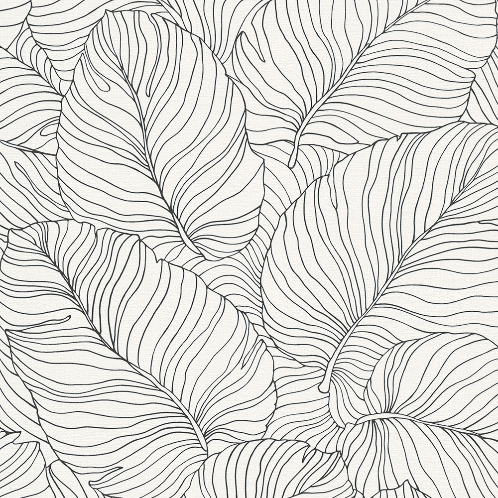 Bílá vliesová tapeta s výrazným plastickým vzorem obrysů listů.