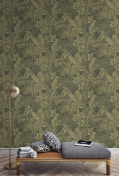 Zelená vliesová tapeta se zlatými listy palem a jemnými obrysy květů ibišku.