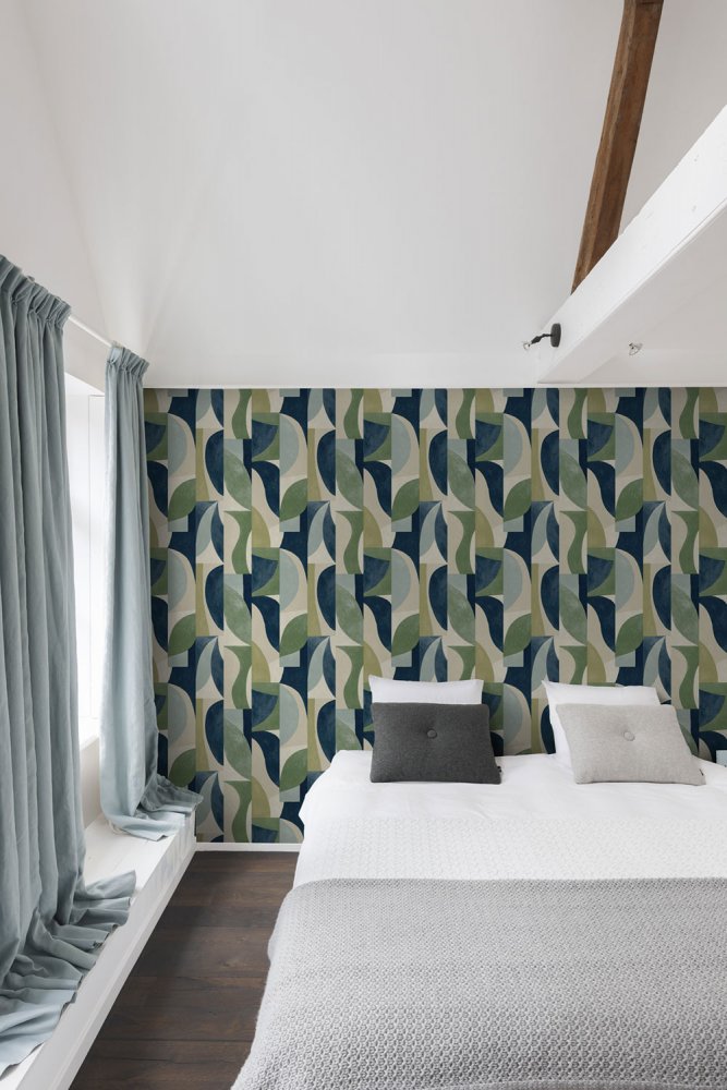 Moderní geometrická vliesová tapeta v modrých, béžových a zelených tónech.