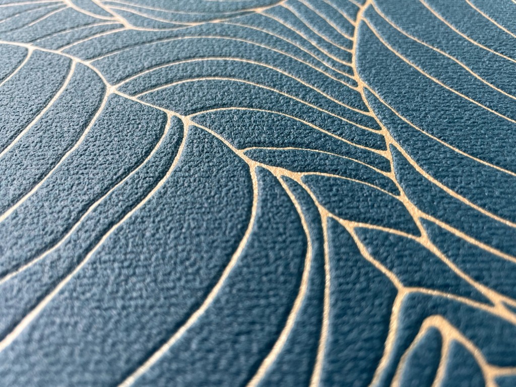 Zeleno-modrá vliesová tapeta s výrazným plastickým vzorem a zlatými obrysů listů.