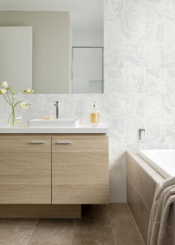 Doprodej - Koupelnová a kuchyňská šedo-stříbrná vliesová tapeta s jemným plastickým vzorem imitující dlaždičky.