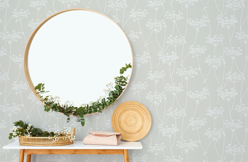 Přírodní a rostlinné motivy zpříjemní a zútulní každý interier. Světle zelená vliesová tapeta s bílým rostlinným motivem.