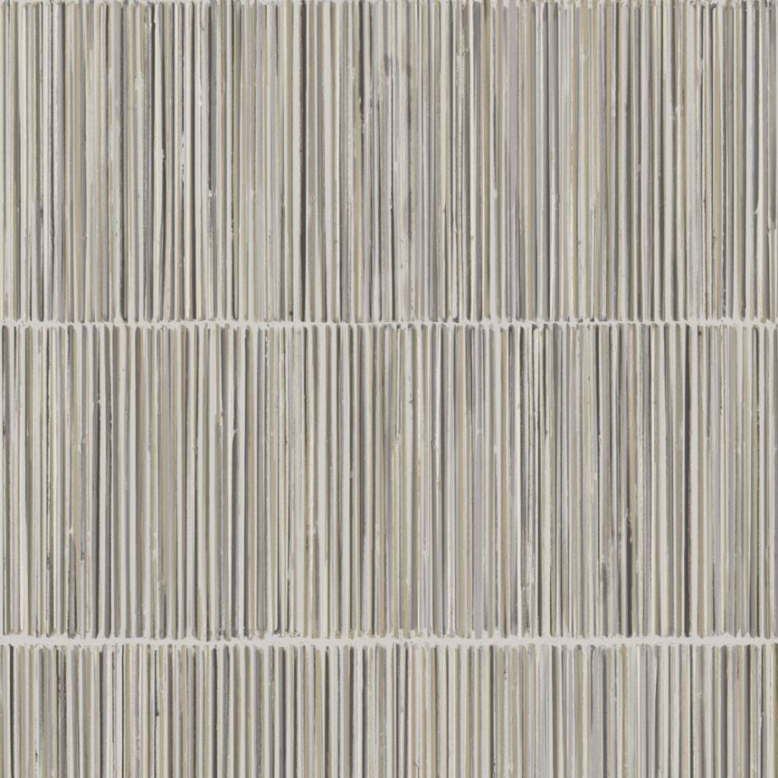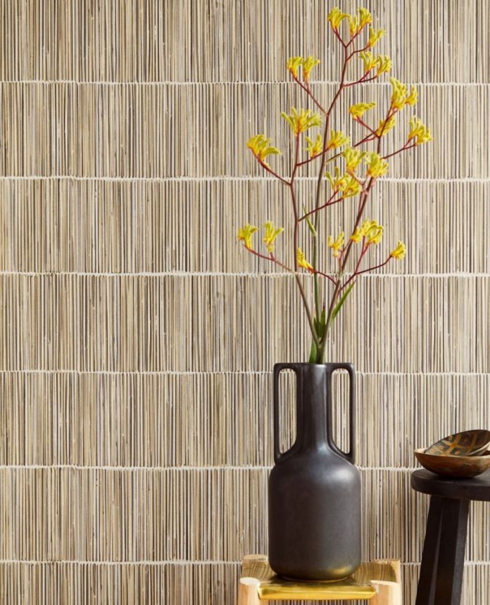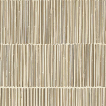 Vliesová tapeta s jemně plastickou texturou. Imitace bambusové rohože v pololesklých tónech šedé, šedo-stříbrné a zlatavé.
