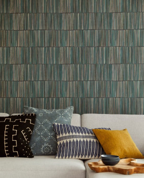 Vliesová tapeta s jemně plastickou texturou. Imitace bambusové rohože v decentních pololesklých tónech zelené, černé a hnědé.