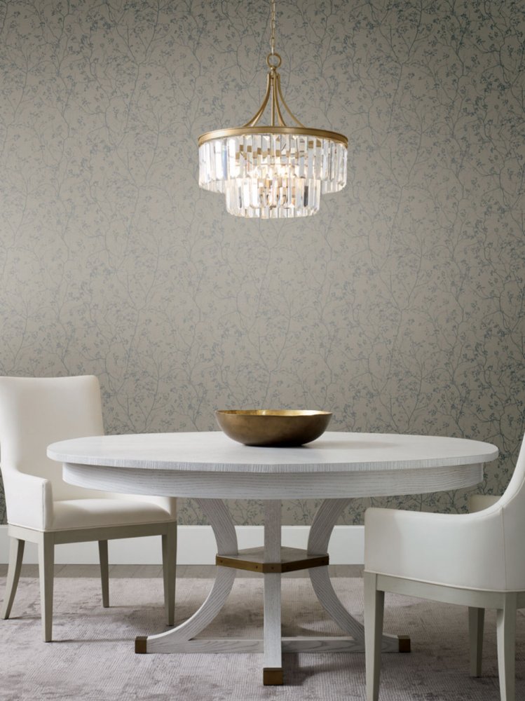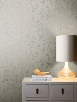 Šedá vliesová tapeta na zeď, stříbrné metalické větvičky. Tapeta vhodná do obývacího pokoje, nebo do ložnice.