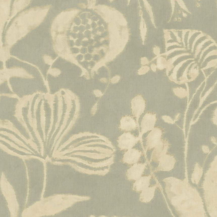 Vliesová tapeta s vinylovým povrchem - imitace hrubě tkané látky s botanickým batikovaným efektem v tlumených zeleno-šedých tónech, vzor béžový.