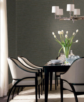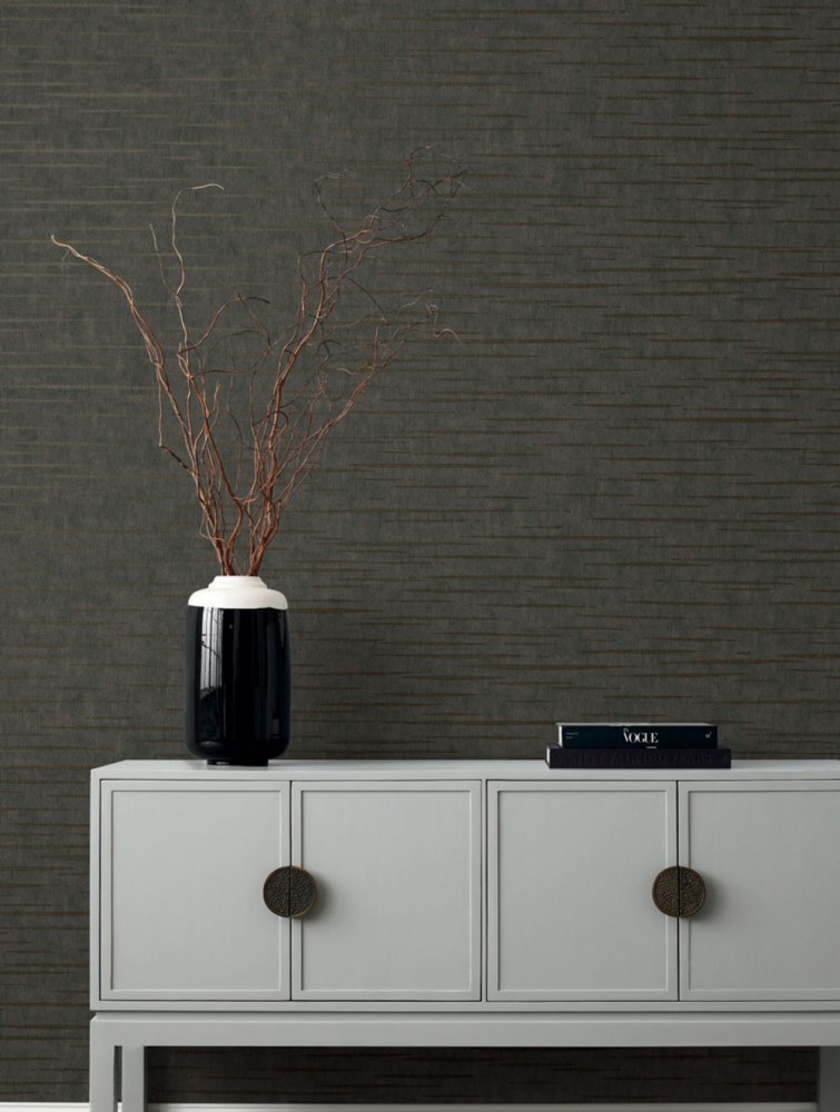 Tmavá šedo-hnědá vliesová tapeta na zeď, kovově lesklé metalické pruhy.