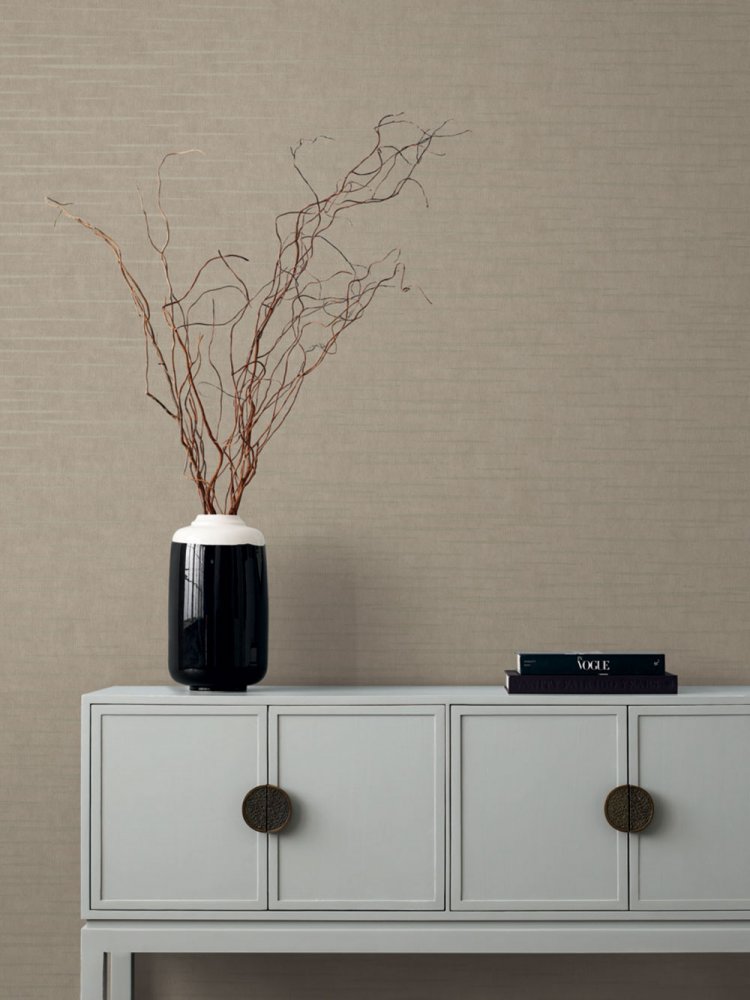 Hnědé-šedá vliesová tapeta na zeď, kovově lesklé zlaté vodorovné pruhy.