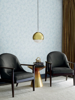 Metalická modrá vliesová tapeta na zeď, bílé listy ginkga.
