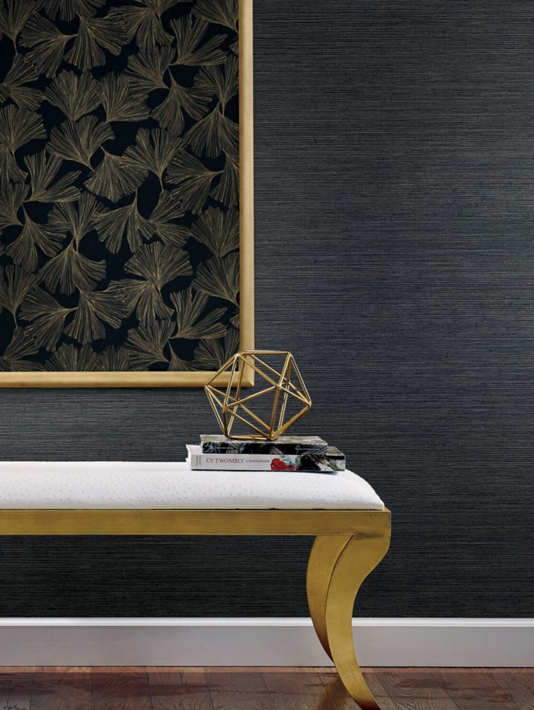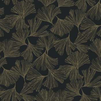 Černá vliesová tapeta na zeď, zlaté listy ginkga.
