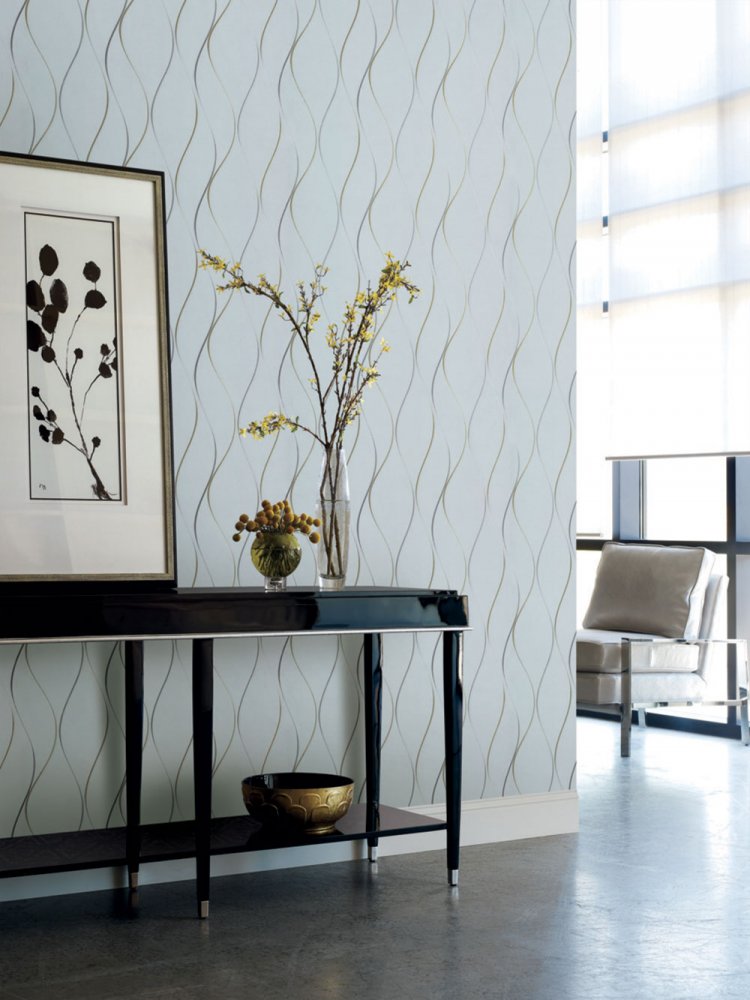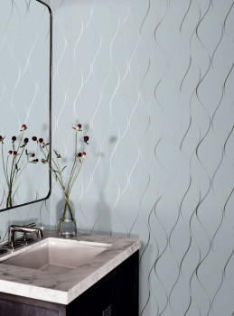Šedo-modrá vliesová tapeta na zeď, metalické zlaté a stříbrné vlnky.