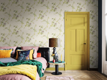 Vliesová tapeta na zeď s vinylovým povrchem a motivem rostlin a květů na bílém podkladu.