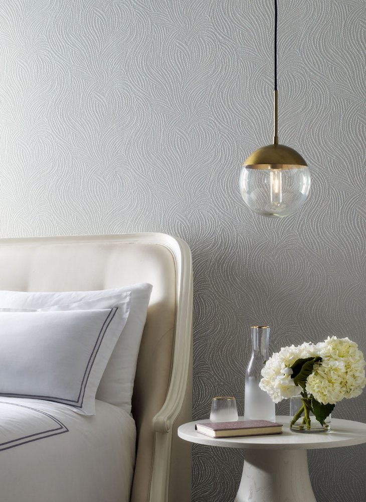Světle šedá vliesová tapeta na zeď, vzor "bouře" z drobných skleněných perliček.