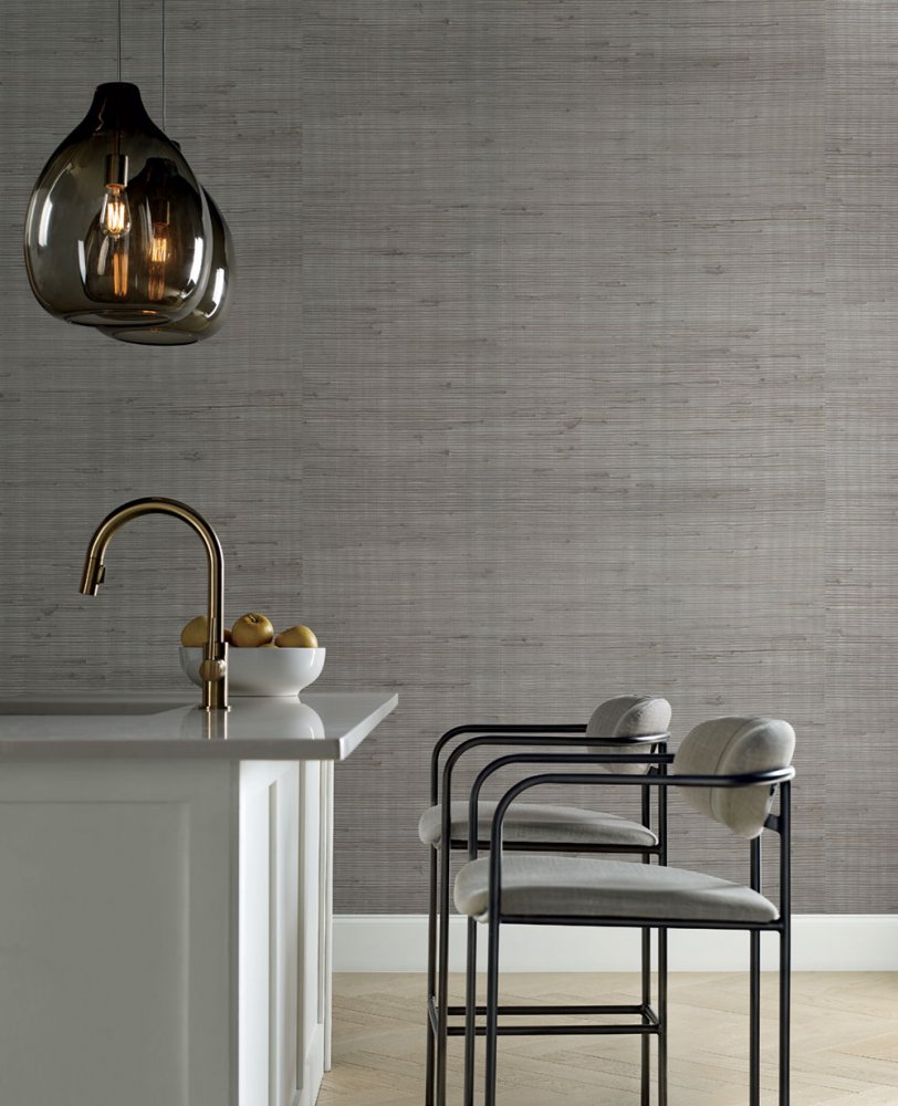Netradiční přírodní tapeta na zeď - přírodní juta v modro-šedých pdstínech na stříbrném papírovém podkladu.