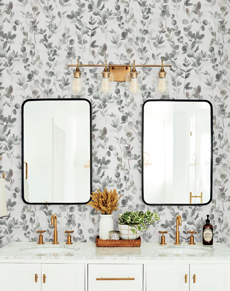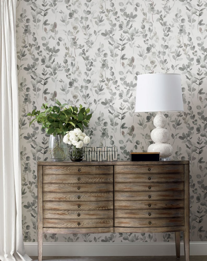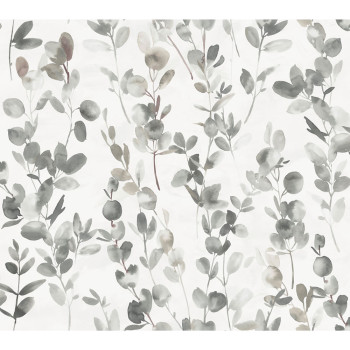 Hladká vliesová tapeta na zeď, listy a větvičky eukalyptu v odstínech šedé a šedo-béžové.