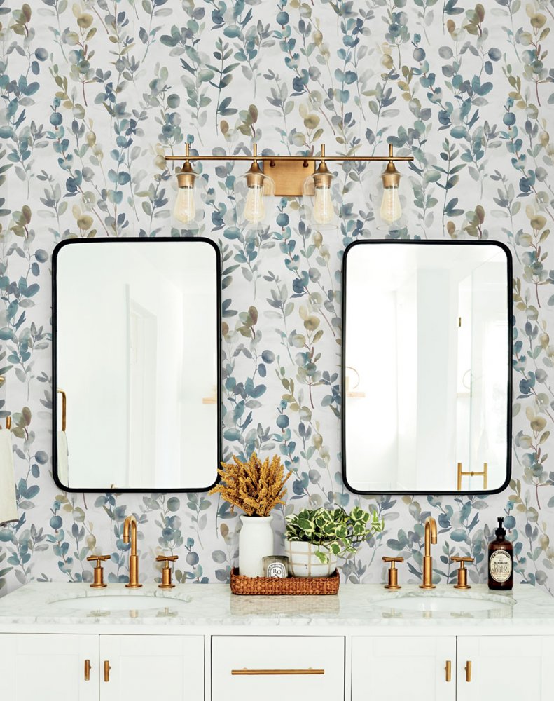 Hladká vliesová tapeta na zeď, listy a větvičky eukalyptu v odstínech tyrkysové, zelené, modré.