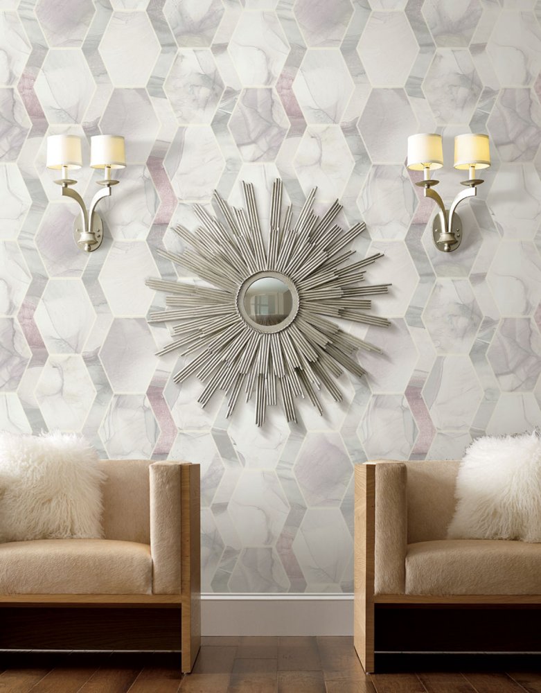 Hladká vliesová tapeta na zeď, imitace mramorového obkladu v odstínech šedé a fialové.