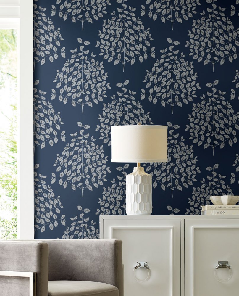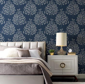 Tmavě modrá hladká vliesová tapeta na zeď, stříbrný vzor větviček a listů.