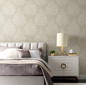 Metalická krémová vliesová tapeta na zeď, plastický bílý vzor větviček a listů.