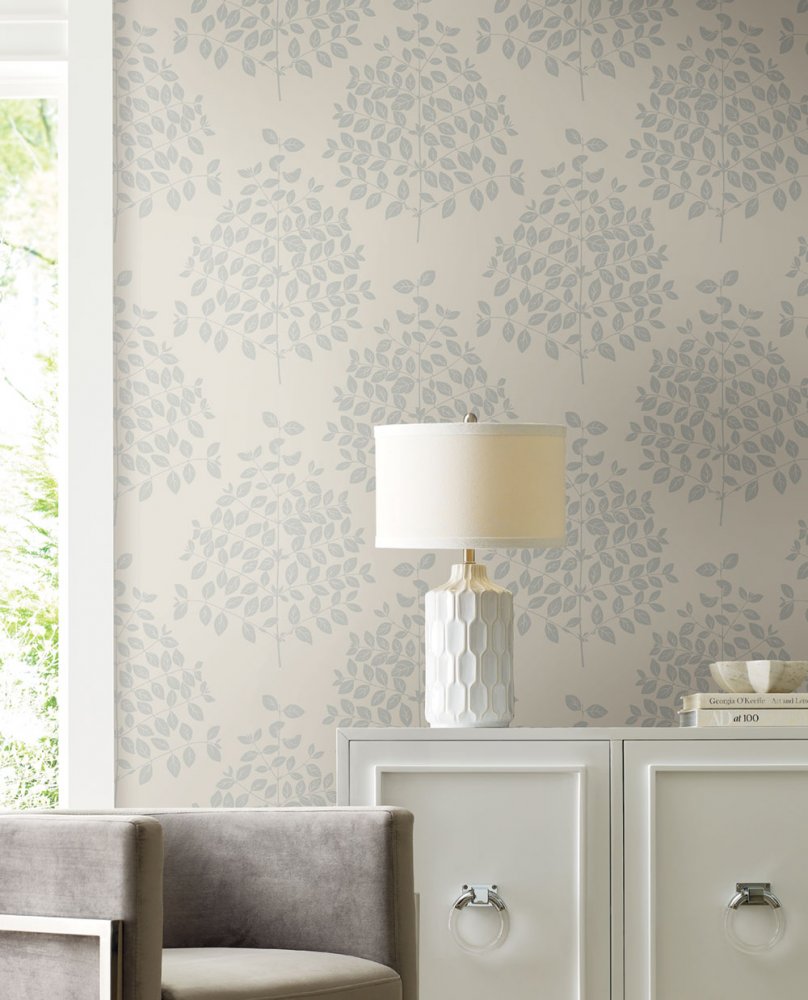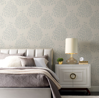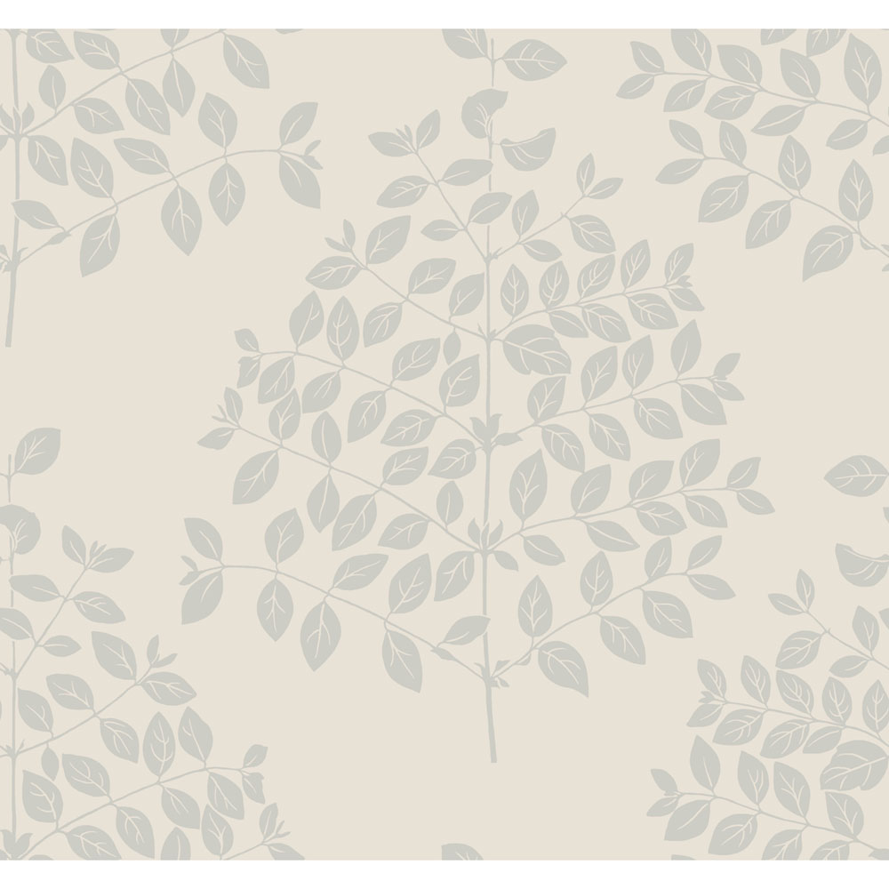 Krémová vliesová tapeta na zeď, stříbrný vzor větviček a listů.