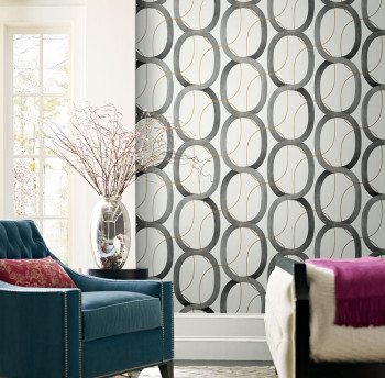 Hladká vliesová tapeta na zeď, černé a zlaté geometrické vzory - ovály - na jemně žíhaném podkladu.
