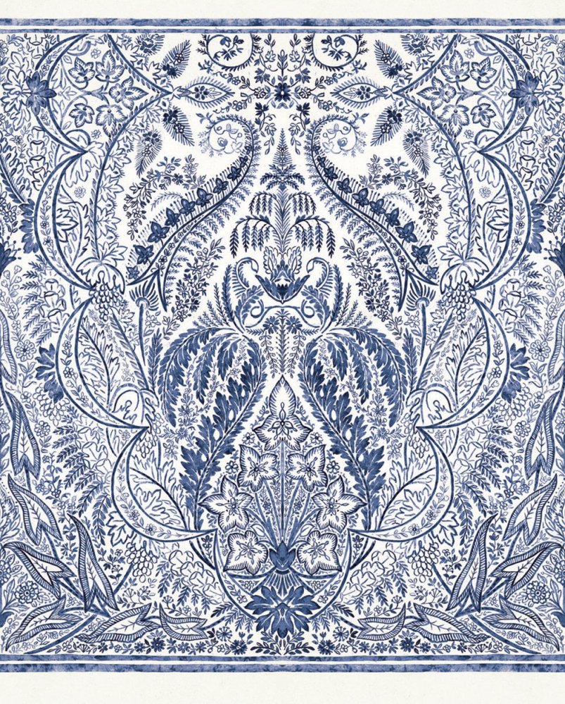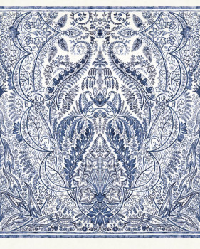 Modrobílá předklížená obrazová tapeta na zeď bohatý ornamentální vzor inspirovaný přírodou.