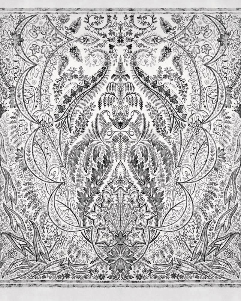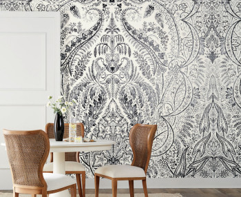 Černobílá předklížená obrazová tapeta na zeď bohatý ornamentální vzor inspirovaný přírodou.
