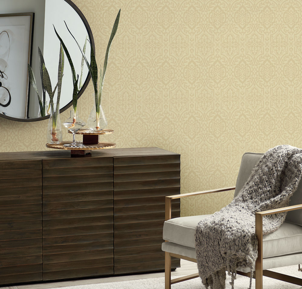 Okrová jemně plastická předklížená tapeta na zeď - ornamentální vzory.