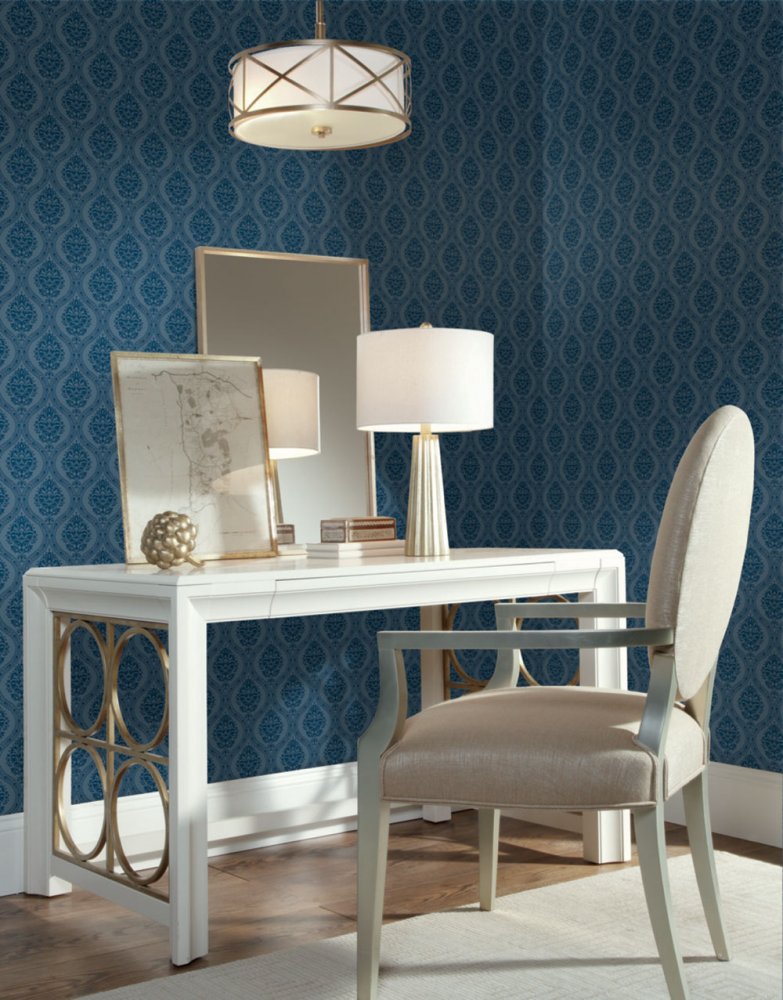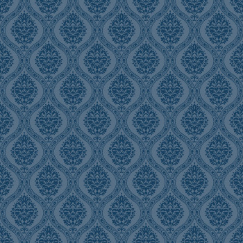 Modrá předklížená tapeta na zeď, jemně plastický zámecký damaškový vzor.