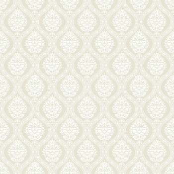 Béžová předklížená tapeta na zeď, bílý jemně plastický zámecký damaškový vzor.