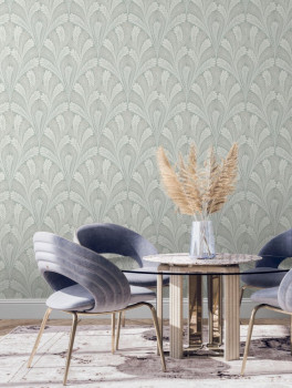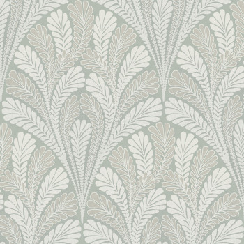 Zelená hladká předklížená tapeta na zeď - šedo-bílé stylizované listy tvoří ornamentální vzor.