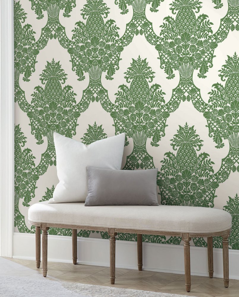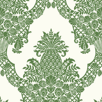 Bílá hladká předklížená tapeta na zeď, zelený květinový ornamentální zámecký vzor, ananas.