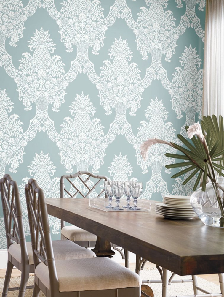 Tyrkysová hladká předklížená tapeta na zeď, modrý květinový ornamentální zámecký vzor, ananas.