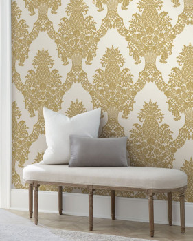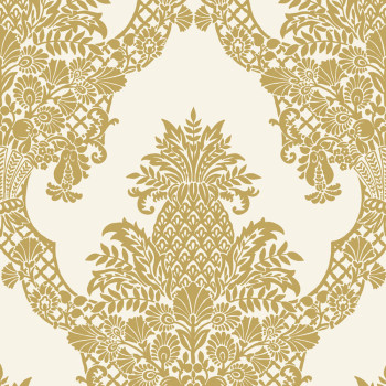 Krémová hladká předklížená tapeta na zeď, hnědo-zlatý květinový ornamentální zámecký vzor, ananas.