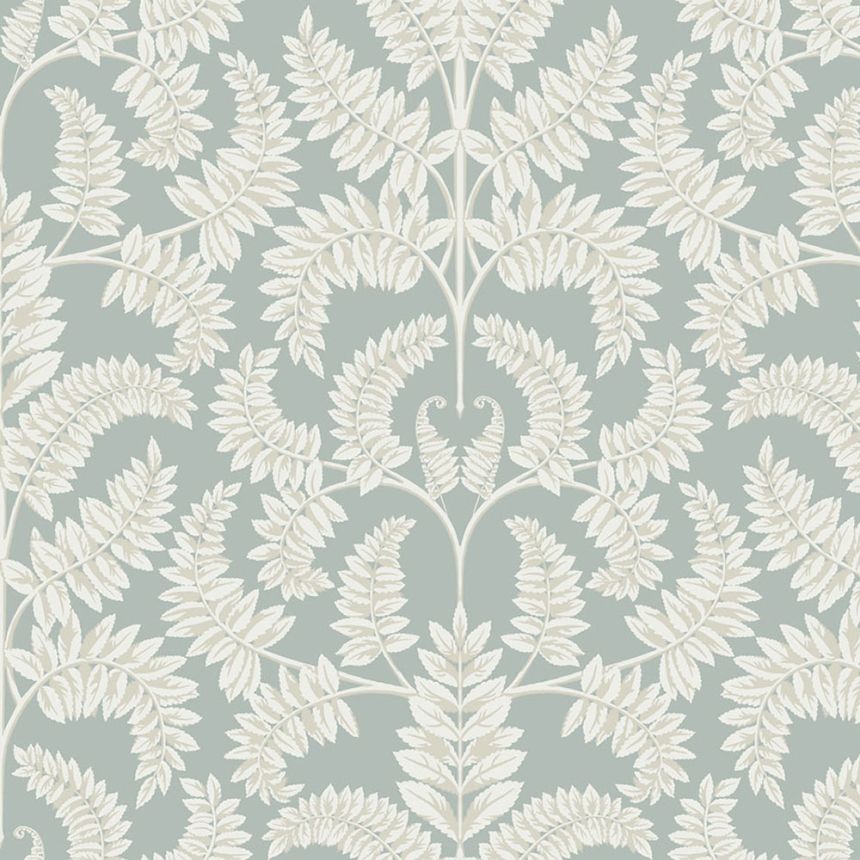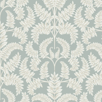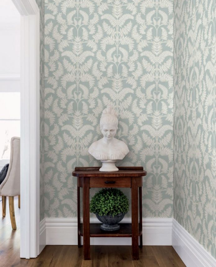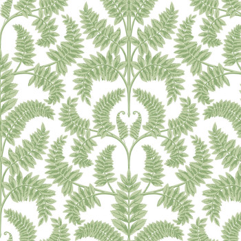 Zelená hladká předklížená tapeta na zeď, bílo-béžové stylizované listy tvoří ornamentální vzory.