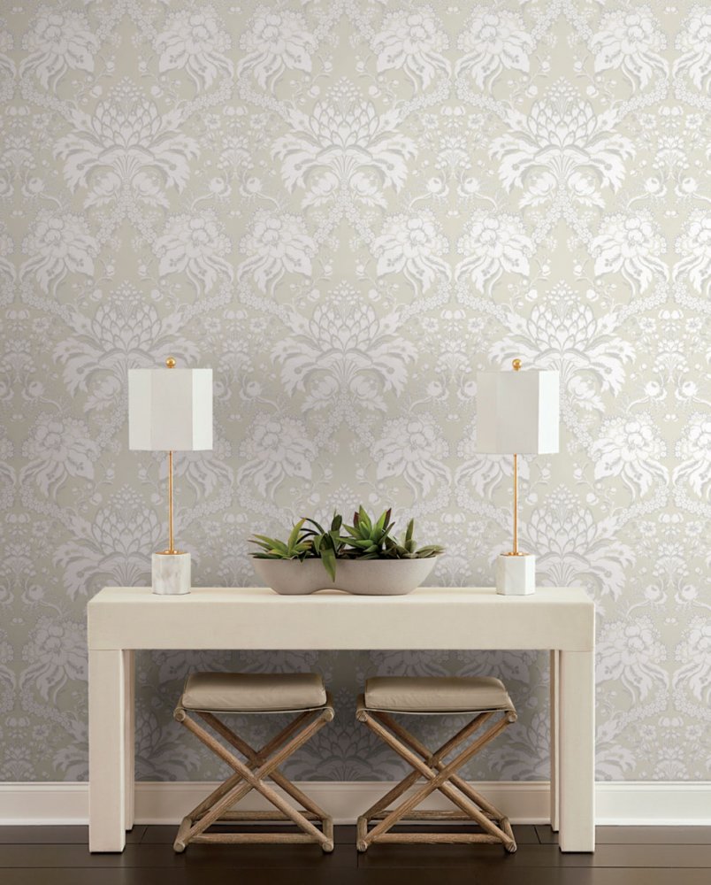 Krémově-bílá hladká předklížená tapeta na zeď, metalické perlové detaily, ornamentální zámecký damaškový vzor.