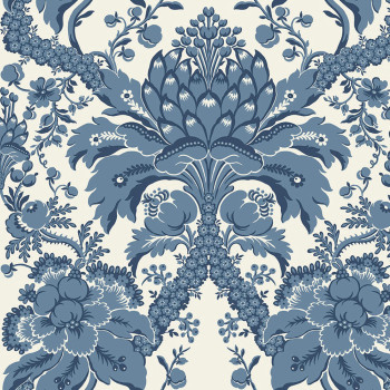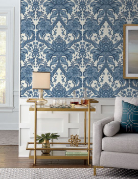 Modrobílá hladká předklížená tapeta na zeď, ornamentální zámecký damaškový vzor.