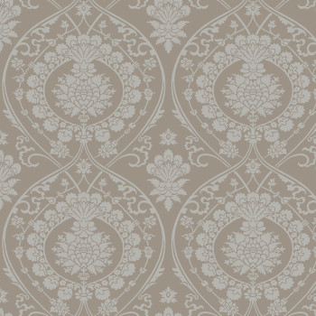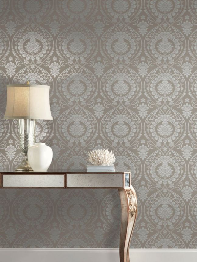 Hnědá předklížená tapeta na zeď, stříbrný jemně plastický ornamentální zámecký vzor.