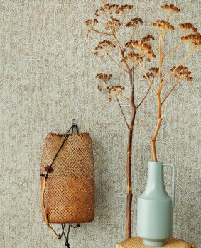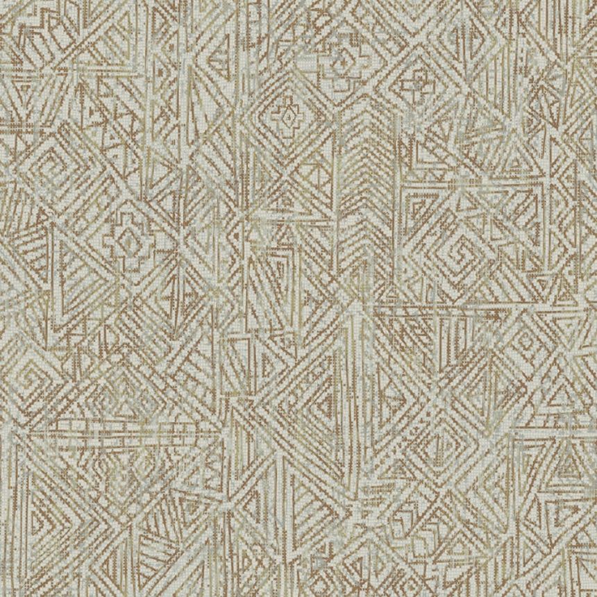 Vliesová, šedo-zelená tapeta. Jemně plastická textura, design etnických kreseb ve zlato-hnědých odstínech.