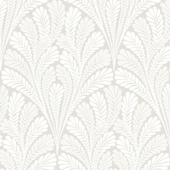 Béžová hladká předklížená tapeta na zeď - bílé a metalické perlové stylizované listy tvoří ornamentální vzor.
