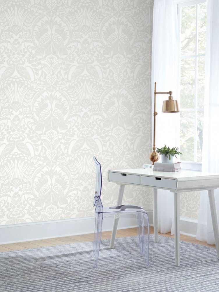 Šedokrémová hladká předklížená tapeta na zeď, bílé listy, ptáci, ornamentální zámecký vzor.