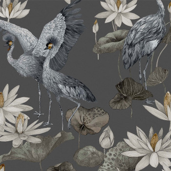 Luxusní vliesová tapeta s motivem lotusů a vodního ptactva v jemných barvách.