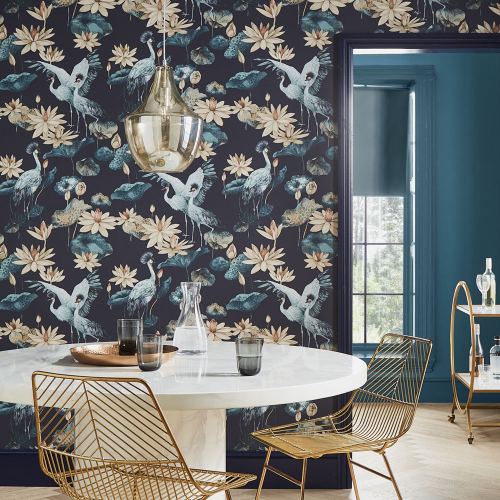 Luxusní vliesová tapeta s motivem lotusů a vodního ptactva v tyrkysové a béžové barvě na černém podkladu.