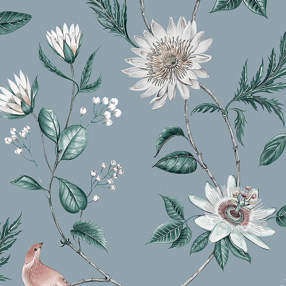 Luxusní vliesová tapeta s exotickými květinami v jemných pastelových barvách na světle šedém podkladu.