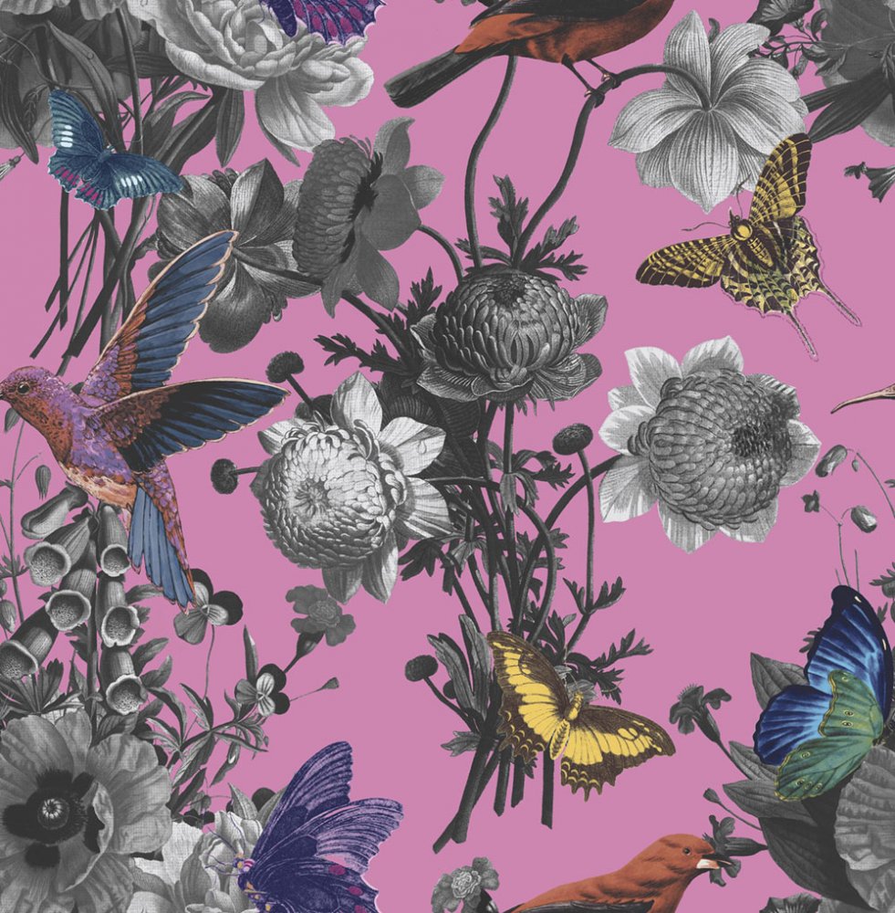 Luxusní vliesová tapeta s motivem květin, motýlů a ptáků v pestrých barvách na růžovém podkladu.