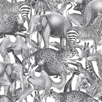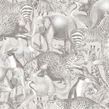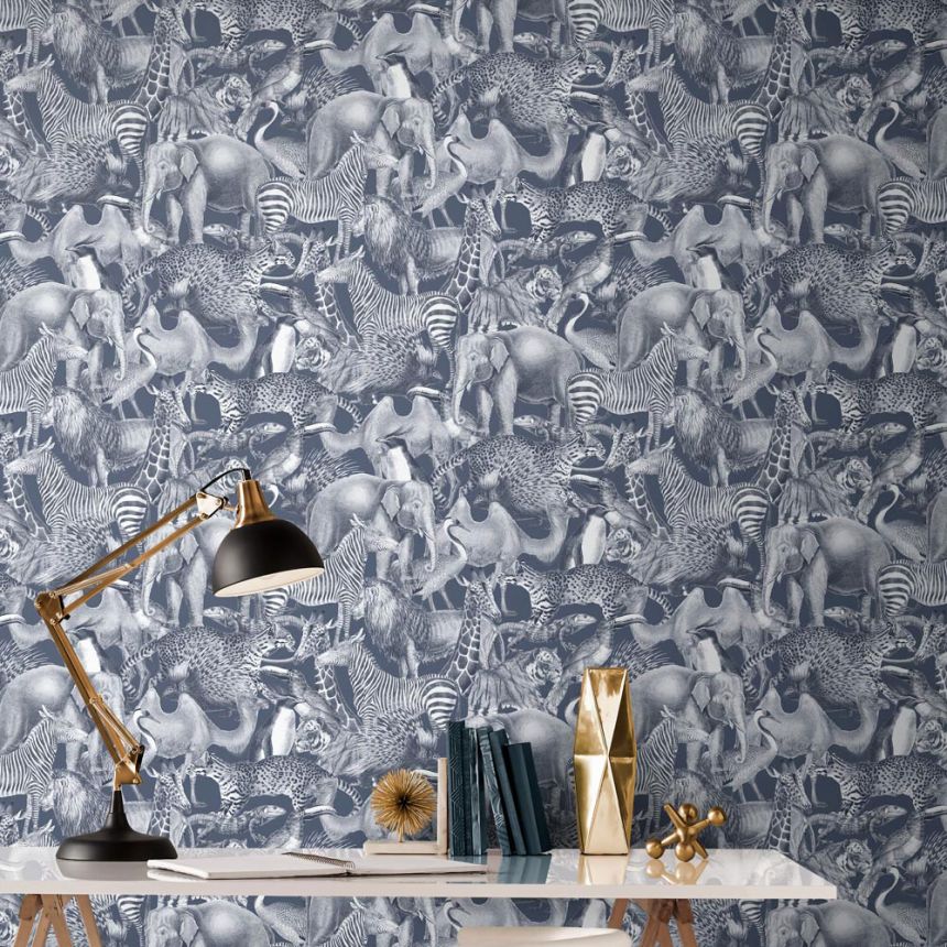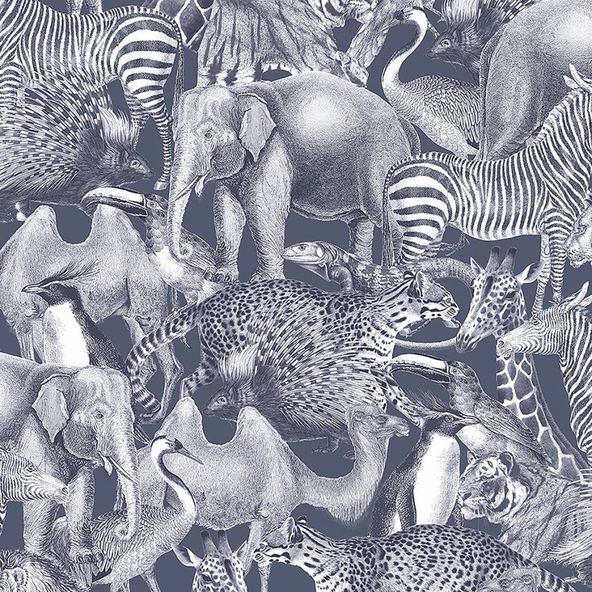Luxusní vliesová tapeta s exotickými zvířaty v šedých barvách na tmavě modrém podkladu.